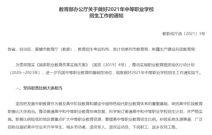 普高职高招生比例按照5:5分配(有一半初中生无缘高中)
