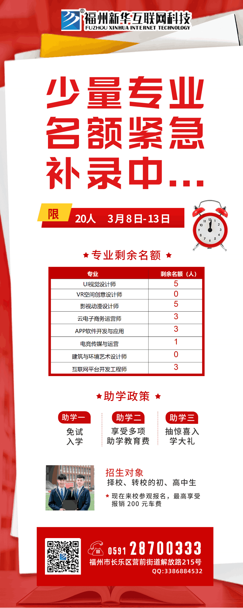 福州新华互联网科技学校目前春季班补录专业包括:UI视觉设计师、影视动漫设计师、云电子商务运营师、APP软件开发与应用、电竞传媒与运营、互联网平台开发工程师等发展前景广阔的专业。