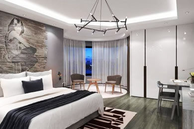 作品介绍:作品中卧室空间以黑、白、灰色为大面积主色,搭配亮色装饰做点缀,体现简约风格,设计中对色彩、材料的质感要求很高,以简洁的表现形式来满足人们对空间环境的需求。