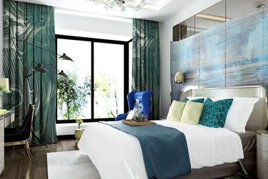 作品介绍:卧室地板设计使用了木地板给人温馨舒适之感,背景墙采用水纹蓝色调的给人自然宁静之感。自然、温馨、简洁、明亮、朴素传递出清爽舒适的韵味。
